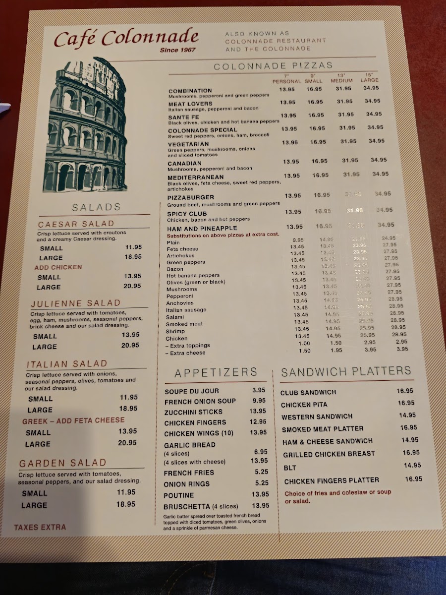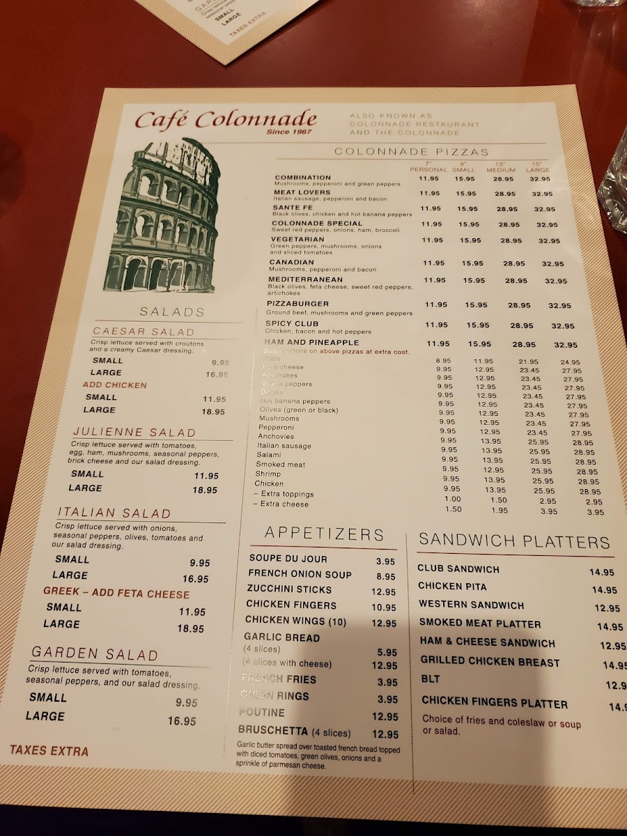 Introducing Colonnade Pizza, a cherished institution nestled in the heart of Ottawa at 280 Metcalfe St. With over two decades of serving the community, this family-owned establishment has become renowned for its exceptional pizza, crafted with the finest fresh ingredients. The menu is an ode to taste and variety, featuring not just pizza but also delectable appetizers like French Onion Soup and Poutine, alongside satisfying sandwiches and pastas.